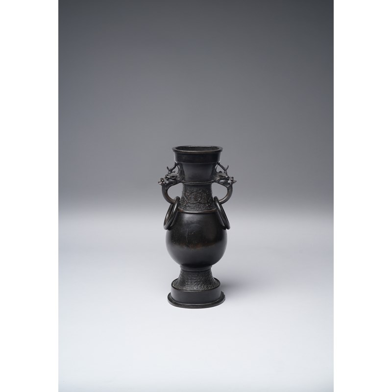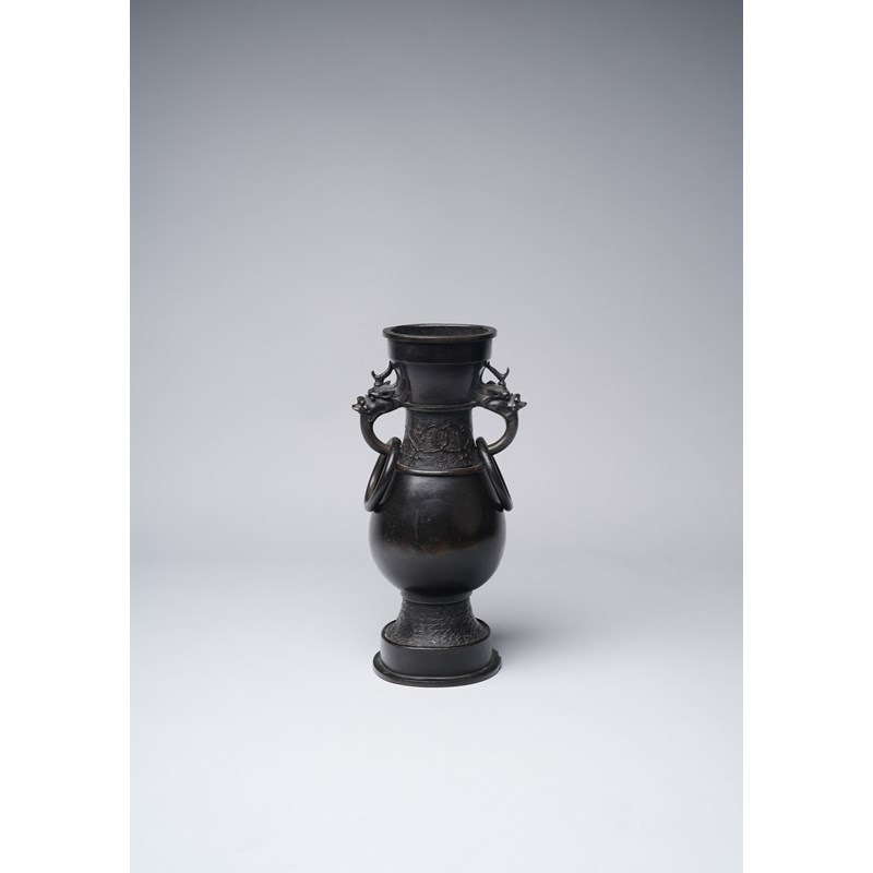 With a pear-shaped body rising from a stepped foot to a waisted neck, flanked by a pair of beast-mask handles and loose rings, decorated with bands of stylised waves and taotie, with a paper label for the Finer Collection 'CB 115 A', 4.9kg, 35cm.