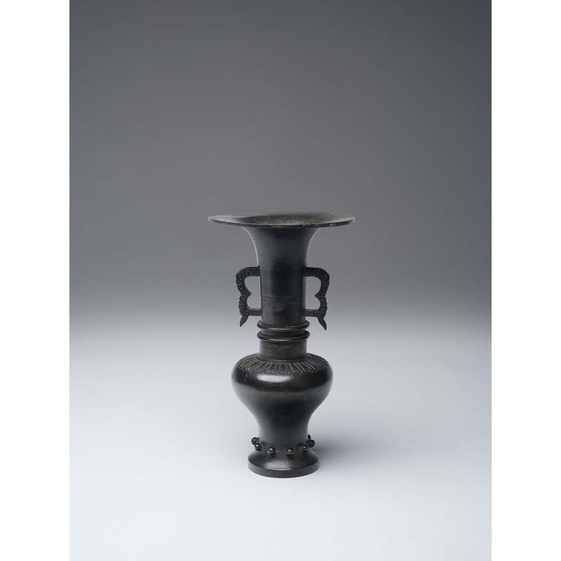 With a bulbous body and a band of lappets to the shoulder, the slender neck with two handles cast with stylised cloud designs and a shallow band of archaistic dragons, the broad flared rim and waisted foot with bands of studs, with a paper label for the Finer Collection 'CB 116', 28.2cm, 1.5kg.