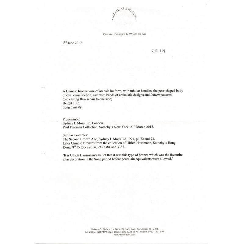 Cf. M Maucuer, Bronzes de la Chine Imperiale des Song aux Qing, p.135, no. 84 for a related example, see also Sydney L Moss, The Second Bronze Age: Later Chinese Metalwork, nos. 72 and 73 for two similar examples dated Southern Song to Yuan dynasty and a discussion on these types of vessels.