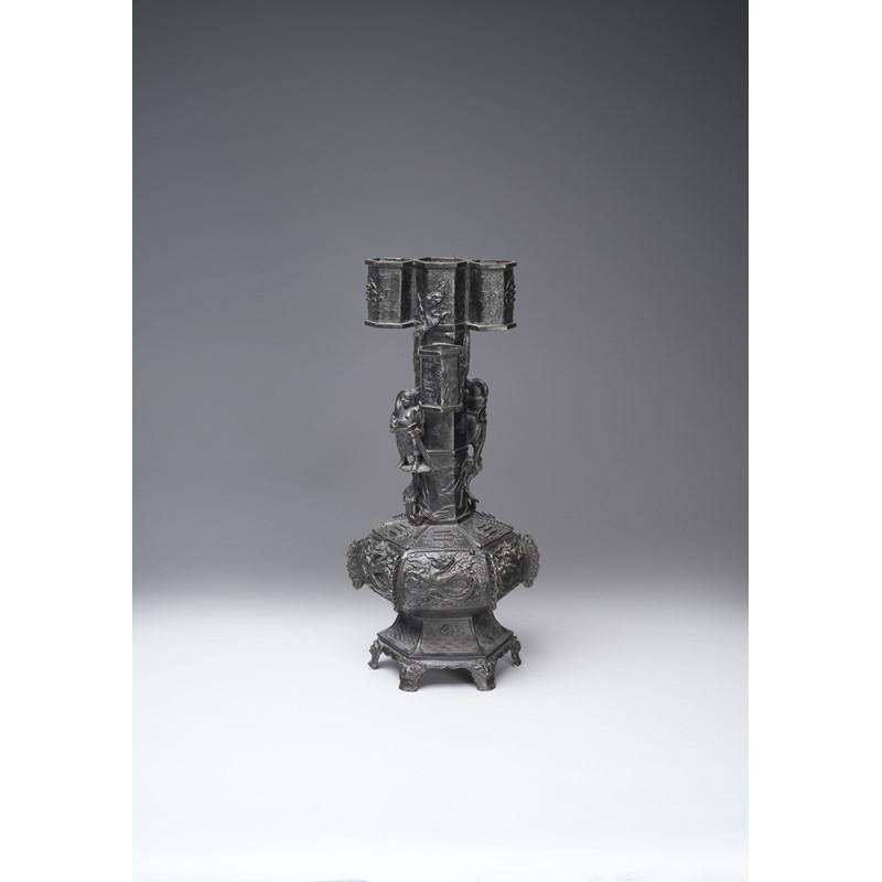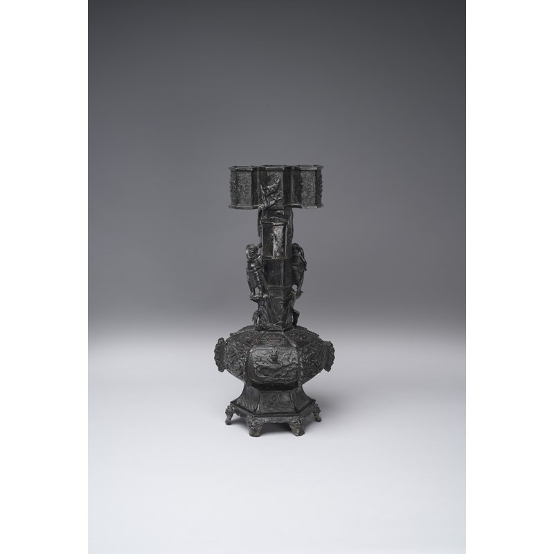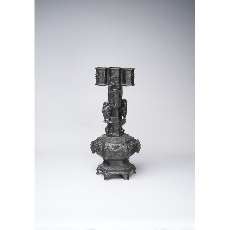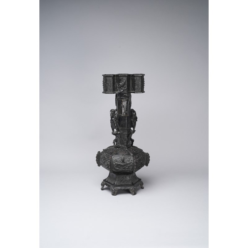The hexagonal-section body rising from six beast-mask feet below panels of waves and foliate motifs, the compressed globular section decorated with six dragons divided ruyi-shaped flanges below six roundels depicting trigrams, the tall neck set with two male figures standing on cloud-shaped platforms, and with two chilong clambering up the sides, the four tubular rings decorated with taotie and the further roundels of trigrams, with a paper label for the Finer Collection 'CB 30', 11kg, 59.5cm.