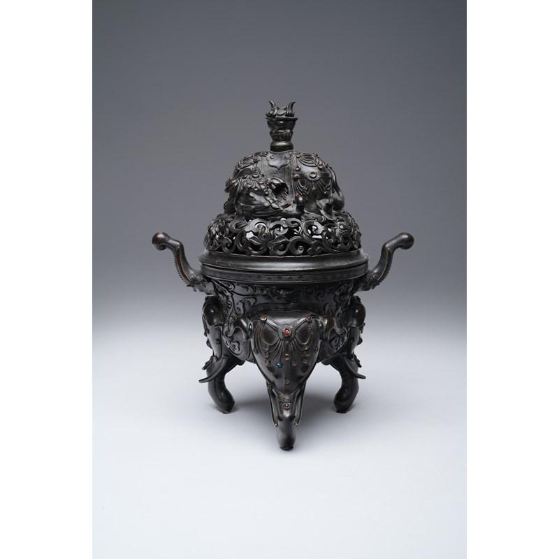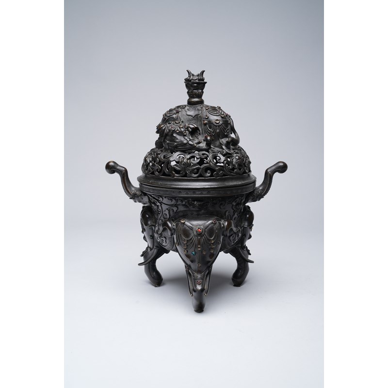 Raised on three elephant-head feet with bejewelled headdresses, the body decorated with bands of key fret and scrolling lotus tendrils, set with two elephant-trunk handles, the openwork cover with further scrolling lotus and surmounted by a recumbent caparisoned elephant topped with a boshanlu finial, with a paper label for the Finer Collection 'CB 12', 4.3kg, 34cm. (2)