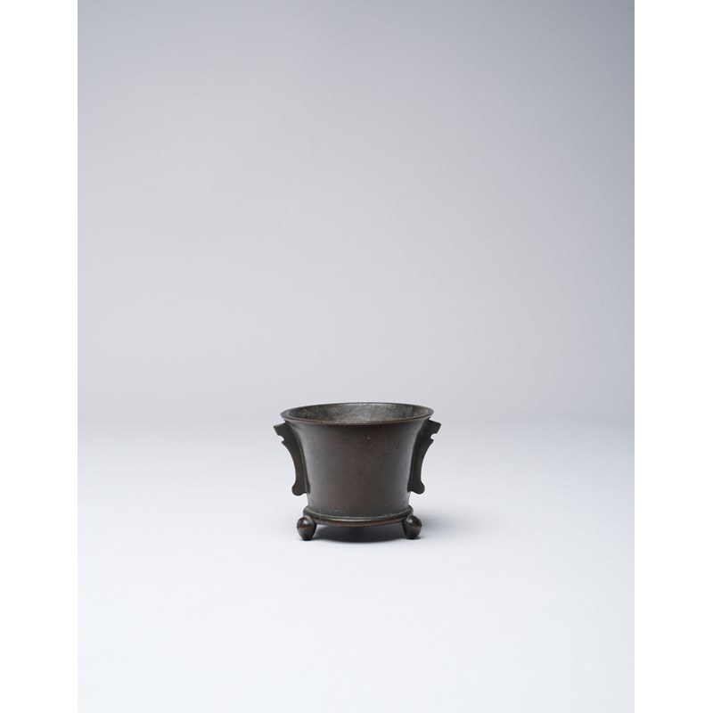 Of tapering cylindrical form set with two flanges to the sides, raised on three globular feet, the base with a six-character Xuande mark, with a paper label for the Finer Collection 'CB 66', 277g, 8.5cm.