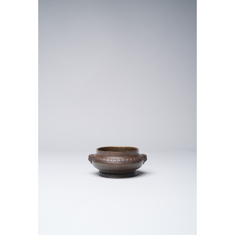Of compressed globular form, cast with three bands of lotus lappets in low relief, the sides flanked by a pair of beast-mask handles, the base with a six-character Xuande mark, with a paper label for the Finer Collection 'CB 120', 537g, 13.7cm.