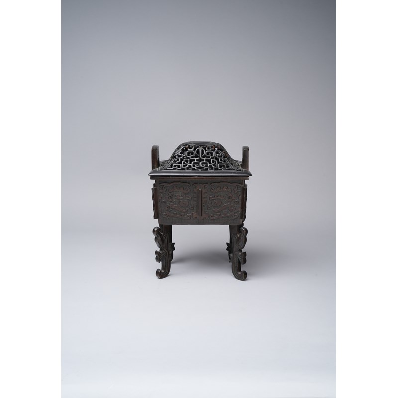 Of rectangular form, the sides decorated with taotie in relief and flanges reserved against a ground of leiwen, with two upright handles, raised on four scrolling legs, with a wood cover, with a paper label for the Finer Collection 'CB 84', 7kg, 33cm. (2)