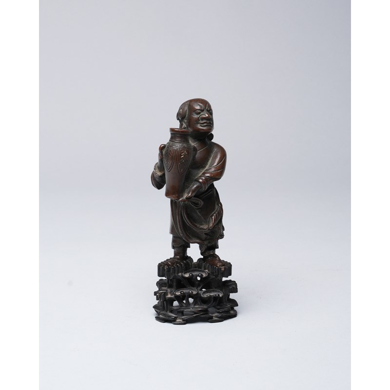 The figure wearing loose robes and holding a two-handled vase, with a wood stand, with a paper label for the Finer Collection 'CB 108', 1kg, 15cm. (2)
