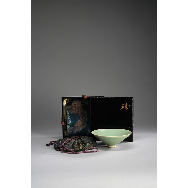 The shallow conical bowl rising from a short straight foot, covered overall in an unctuous blue-green glaze pooling to a deeper blue at the interior well and thinning at the rim, with a silk drawstring bag and a Japanese lacquered wood box, 15.1cm.