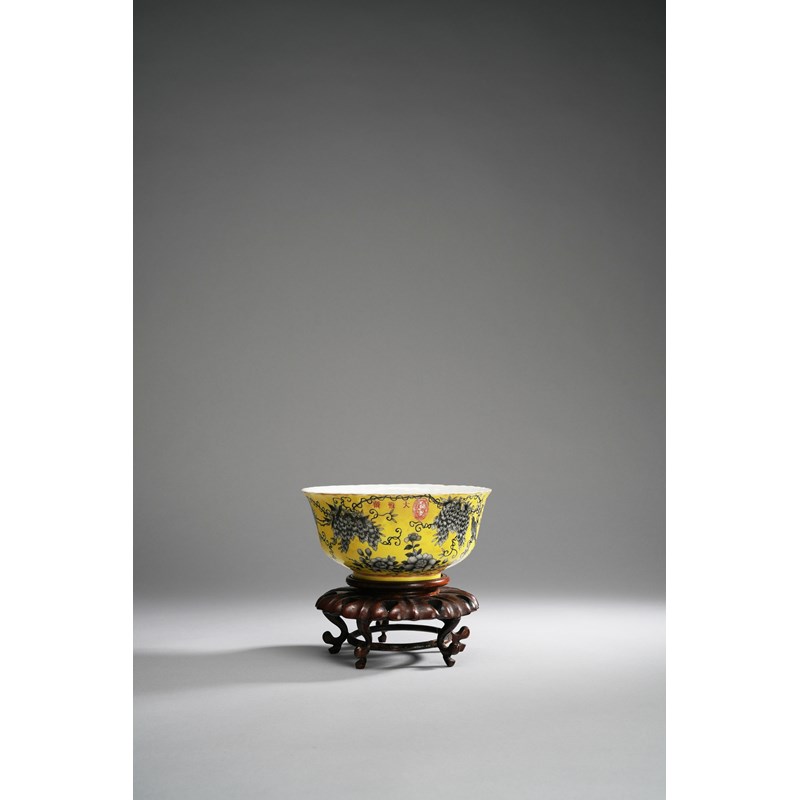 The bowl with ribbed, flared sides, painted en grisaille with a magpie perched amongst flowering branches of wisteria and peony, on a vibrant lemon-yellow ground, the base with a four-character Yong qing chang chun mark (eternal prosperity and spring), with a wood stand, 17.5cm. (2)