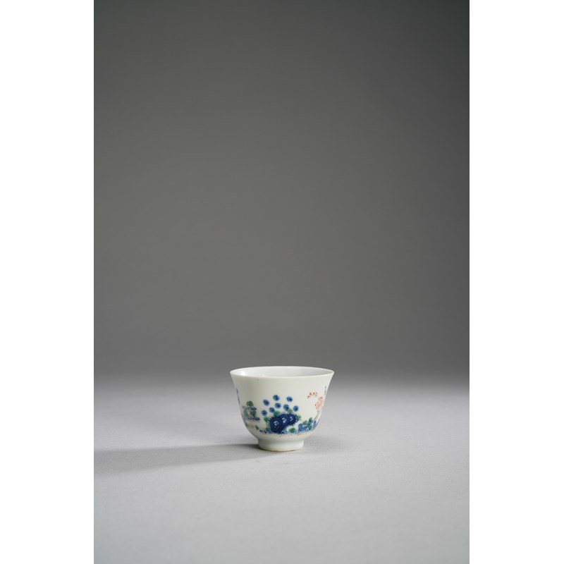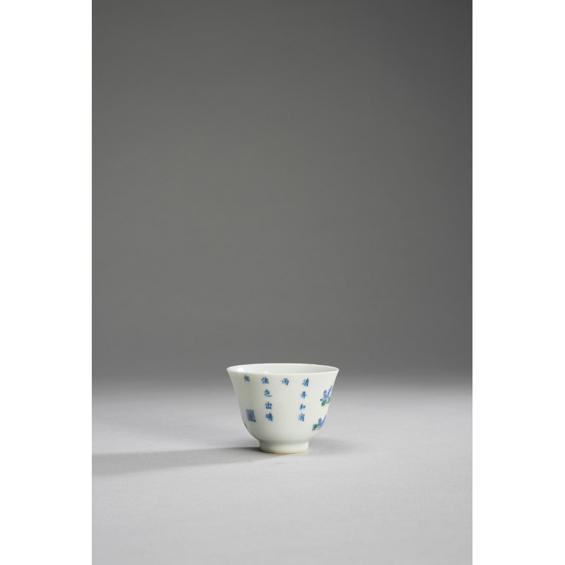 Painted in enamels and underglaze blue with a flowering crab apple tree amongst rocks and smaller plants representing the second month, the reverse with a poem which reads:
