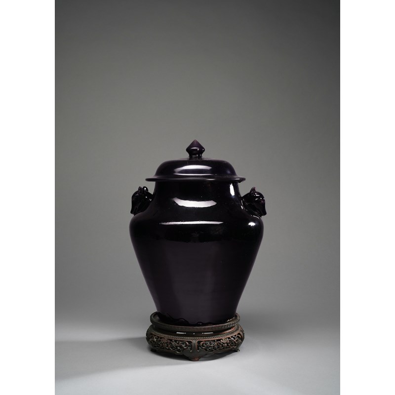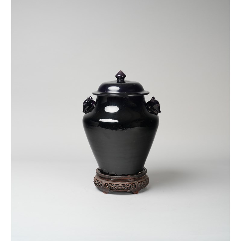 The body of tapering form, the sloping shoulder applied with a pair of deer-head handles, the exterior covered with a glaze of deep aubergine tone, the cover with a lotus bud finial, with a wood stand, 35cm. (3)