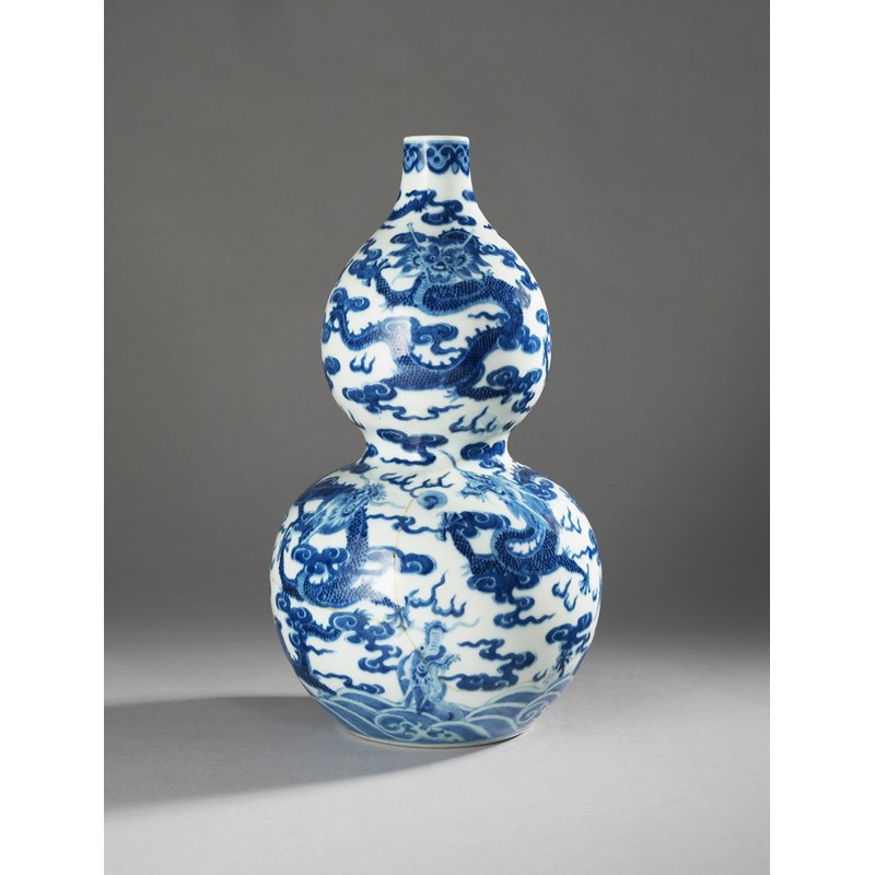 A RARE CHINESE BLUE AND WHITE DOUBLE-GOURD 'NINE DRAGON' VASE