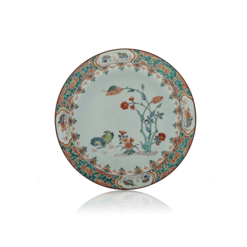 This unusual but well-executed design once again demonstrates the confusion that Dutch-decorators held over the source of Oriental decoration, combining on one plate elements of Japanese and Chinese designs to attractive, but distinctly European, effect. Note the parrots where the quail should be.