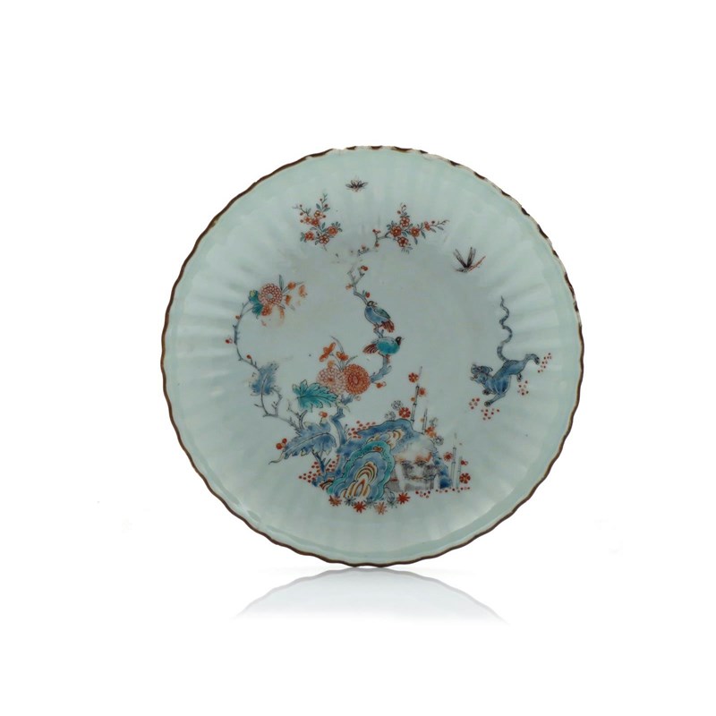 A Chinese porcelain Dutch-decorated saucer dish late Kangxi c.1710-22, the fluted sides descending to a flat well, enamelled in Holland with a Kakiemon design of an exuberant tiger bounding towards two birds perched in flowering prunus above a banded hedge and rockwork, 23cm.