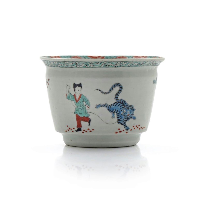 A rare Japanese porcelain Dutch-decorated apothecary pot 2nd half 17th century, later-enamelled in Holland in the Kakiemon manner with a boy leading a blue striped tiger on a lead, the reverse with a bird perched on flowering prunus beside pine and banded bamboo hedges, the interior rim with red flowerheads on a green cracked ice ground, 8cm high.
