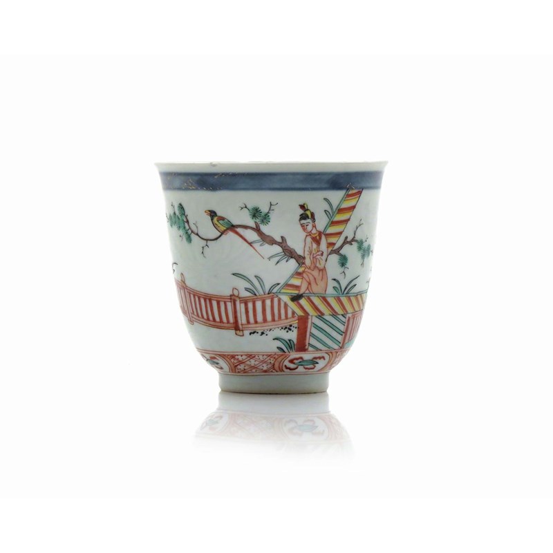 A tall Chinese porcelain Dutch-decorated U-shaped cup or beaker 1st half 18th century, with original anhua floral decoration beneath a narrow hatched band in underglaze blue, later-enamelled in Holland in the Kakiemon style with a figure resting one foot on a striped fence beside a bird perched in a pine tree, a further figure beside a low table on which rests a vase of flowers, 8.5cm high.