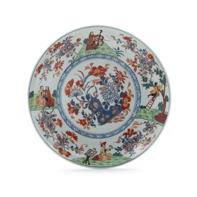 A Chinese porcelain Dutch-decorated dish 1st half 18th century, originally decorated in underglaze blue with a central spray of chrysanthemum within a hatched border, the rim with four further sprays of Chinese flowers, later-enamelled with red and gilt highlights to the original decoration in the Imari-style, the rim with four polychrome vignettes of the Cherry-Picker and Music Party designs, 28cm.
