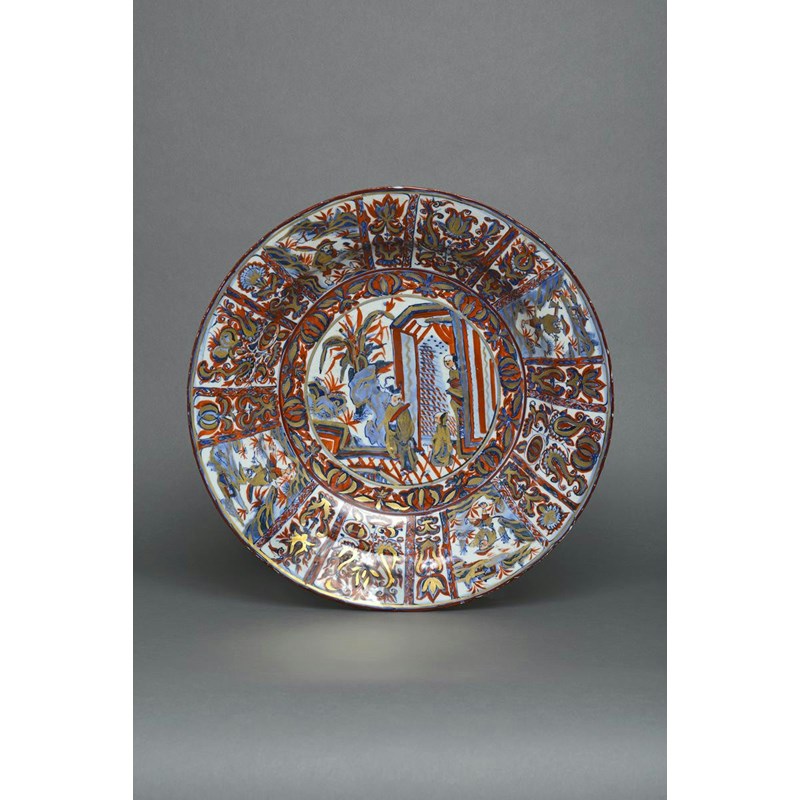 A massive Chinese porcelain charger mid 17th century, originally decorated in underglaze blue in the Kraak style with three figures in a doorway, the wide rim with panels of further figures and flowers, later-enamelled possibly in Holland in the Imari style with red and gilt highlights to the original decoration, 48.5cm.