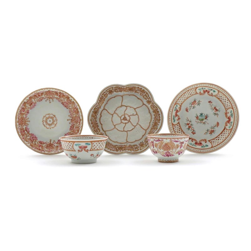 Two Chinese porcelain European-decorated teabowls and saucers 1st half 18th century, later-decorated perhaps in Holland, one with a formal strapwork design in red, black and gilt with puce foliate sprays around, the other with small flower sprays within shaped panels of red crosses, and a lobed hexafoil teapot stand, decorated in red and gilt with overlapping panels in the manner of the Queen's pattern, the rim with a stylized foliate design, 12.8cm max. (5)
