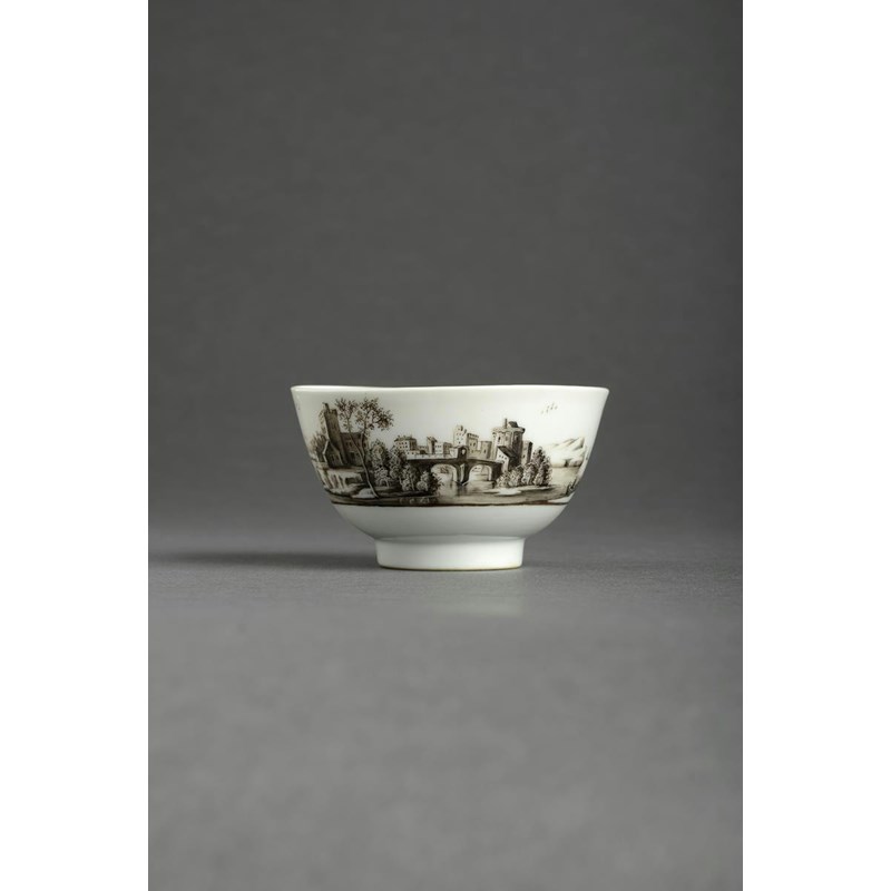 A Chinese porcelain German-decorated teabowl Kangxi 1662-1722, originally left in the white with an underglaze blue mark of a conch shell, later-enamelled en grisaille with a continuous harbour scene of boats and buildings amongst a winding river, 7.5cm dia.