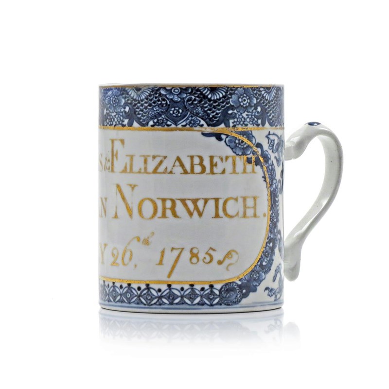 This mug, made later in the 18th century, has been deliberately decorated with the intention of allowing later decoration, probably in Europe. Unfortunately the surname of Newman is a common one in the Norwich area and despite the precise dating it has not been possible to find out anymore about the happy couple.