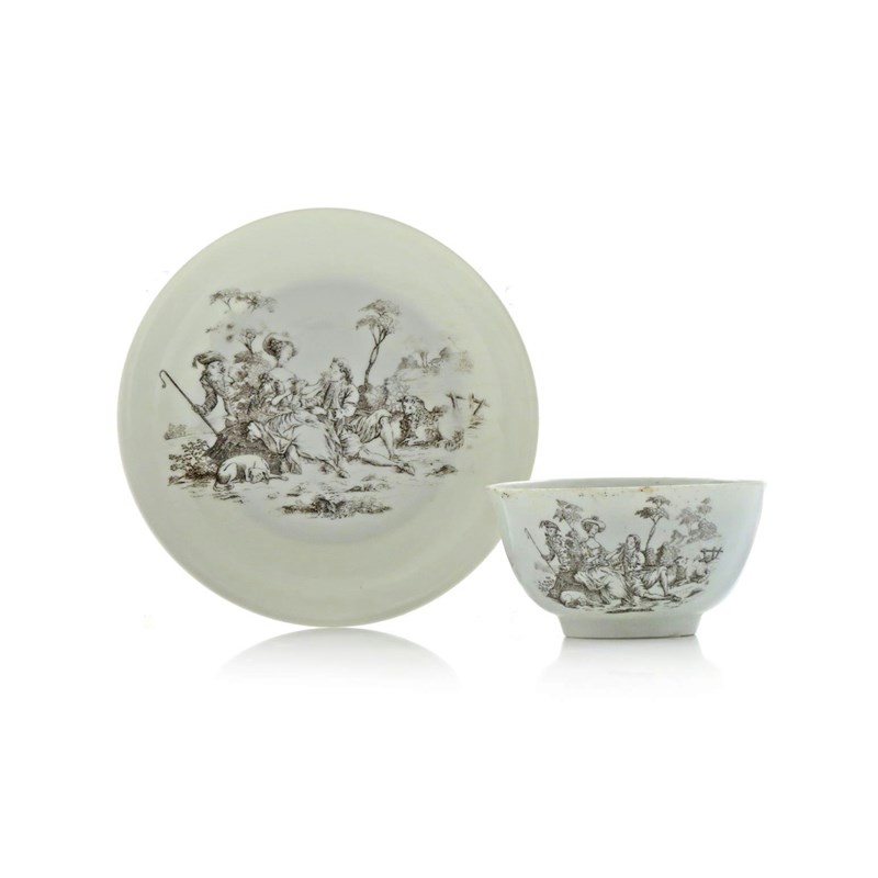 This print is after Jacques Philippe Le Bas's engraving of Francois Boucher's 'Pensent-ils au Raisin?'The print on the Worcester teabowl is unsigned and, since the same print is known on enamel boxes and plaques, it is possible that both the Worcester and the Chinese porcelain were decorated in Birmingham.