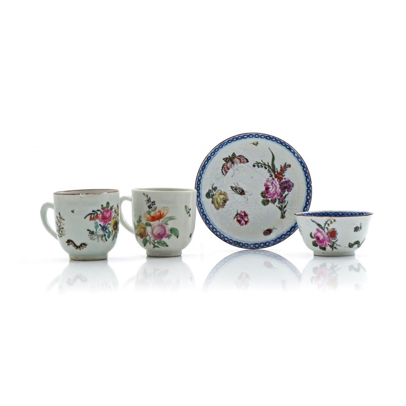 Floral decoration by the London ateliers falls into two categories, as originally defined by Bernard Watney and detailed by Stephen Hanscombe in his book, The Early James Giles and his Contemporary London Decorators. The spiky, pencilled manner of the teabowl and saucer and one cup is indicative of Type A, while the rounder petals and red-dotted caterpillar are classified as Type B. There has been much discussion about the attribution of each type of decoration to differing workshops, but Stephen Hanscombe remained of the opinion that both types were largely the work of the Giles atelier.
