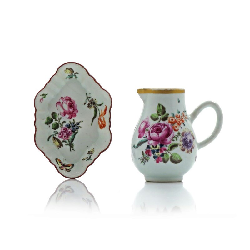 A Chinese porcelain English-decorated small jug and spoon tray 1st half 18th century, originally left in the white and later-enamelled in the London ateliers with European flowers including rose and tulip beside large butterflies and small single sprigs, 13cm max. (2)