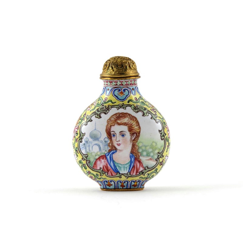 A Chinese Canton enamel snuff bottle early 20th century, painted to each side with a scrolling panel containing a European lady, encircled by foliate designs, a band of ruyi-heads to the neck, the base with a four character Qianlong mark, the gilt metal stopper with a shou character, 6cm.