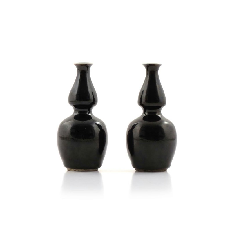 A pair of Chinese mirror-black glazed vases Qianlong 1736-95, each gourd-shaped body decorated with an unctuous black glaze stopping short of the rim, the interior glazed white, each with a paper label for John Sparks, 12.5cm. (2)
