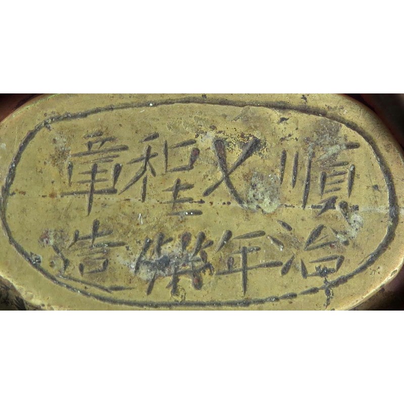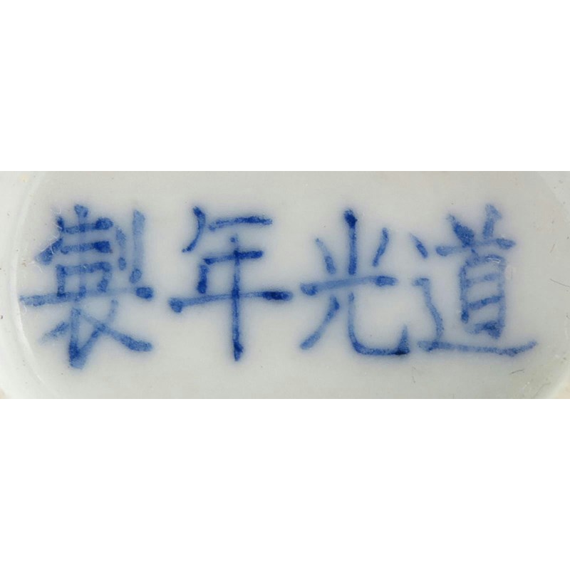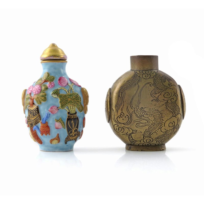 Two Chinese snuff bottles 19th century, one in gilt bronze decorated with a dragon and a flaming pearl of wisdom to each side, the other porcelain, decorated with vases of lotus flowers and leaves, a four character Daoguang mark to the base, 6.8cm. (2)