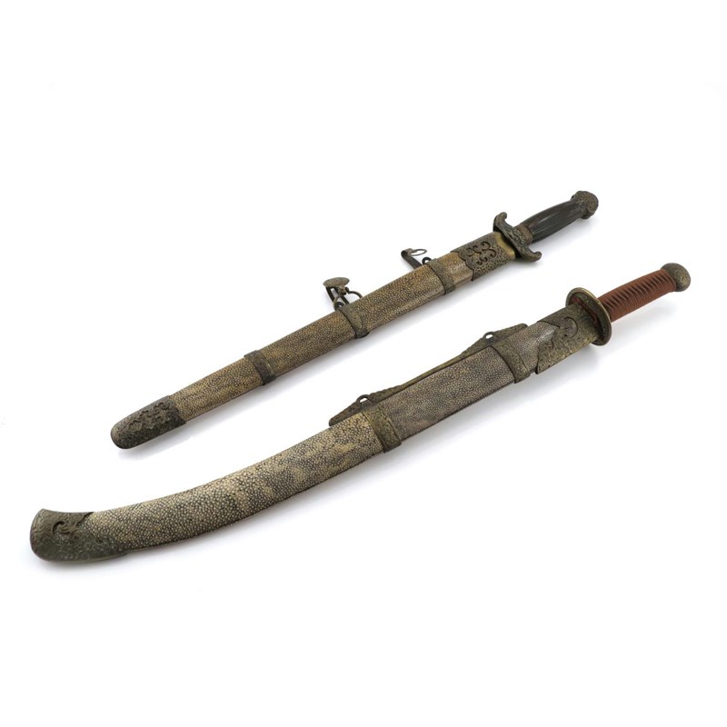 Two swords 19th/20th century, the double sword Chinese, the other Japanese, both with brass-mounted shagreen scabbards, 75cm max. (3)