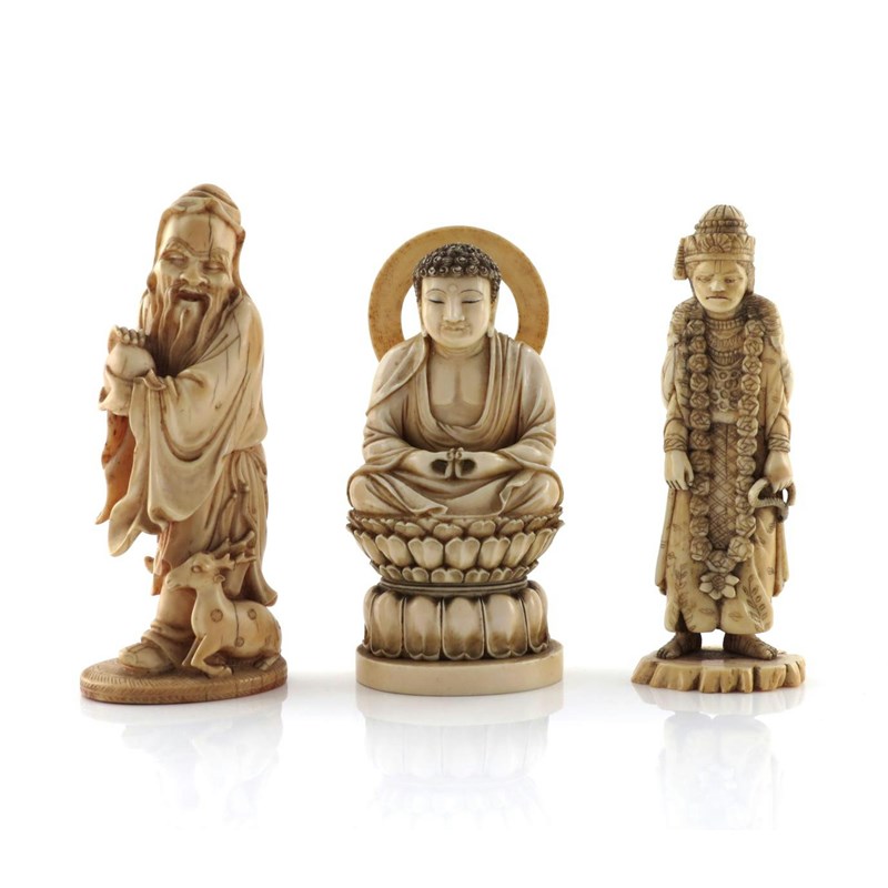 λ Three ivory figures 19th century, one a seated figure of Buddha, another of Shoulao, the third of a Tibetan monk, 15cm. (3)