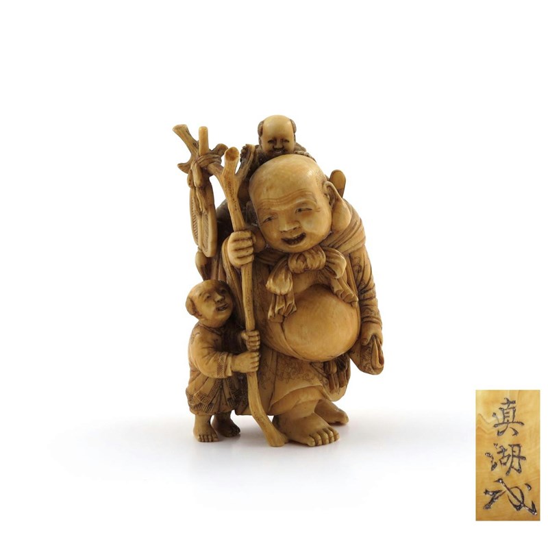 λ A Japanese ivory okimono of Hotei with two karako Meiji 1868-1912, the god carrying a large sack on his back and holding a gnarled staff, the boys on his shoulder and by his side grabbing the stick, signed Naoko/Chokuko with kao, 7,3cm.
