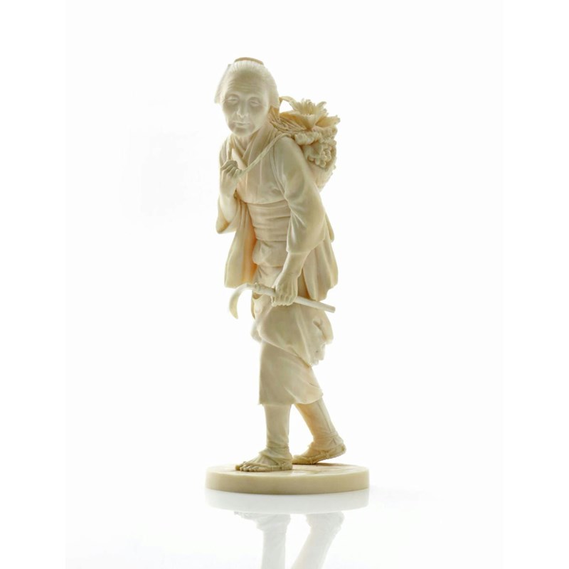 λ A good Japanese ivory okimono Meiji 1868-1912, depicting an elderly woman carrying a basket of grapes and flowers on her shoulders, a sickle in her left hand, signed with a two character mark to the base, 18.4cm.