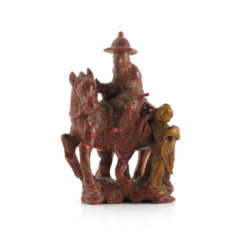 A Chinese soapstone model of an equestrian rider 19th century, wearing flowing robes and a wide-brimmed hat and with a long beard, mounted on his steed, an attendant with a fly whisk standing at his feet, 10.8cm.