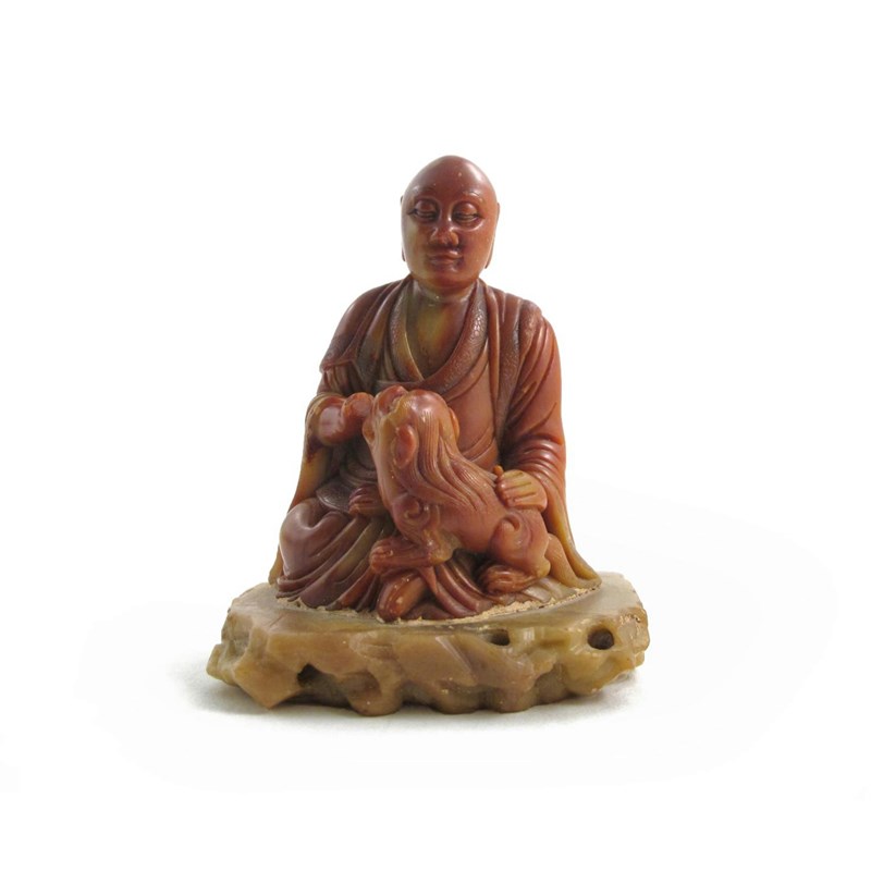 A small Chinese soapstone figure of a luohan 18th/19th century, seated with a Buddhist lion dog on his lap, and raised on a flat base with an irregular border, 8cm.