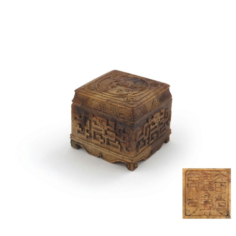 A Chinese soapstone box and cover 19th century, carved in relief with a roundel containing a dragon to the cover, the sides with key fret and geometric designs, raised on short scrolling feet, the base with a six character mark which reads qi shi jing han qian gu qiu, 6cm. (2)