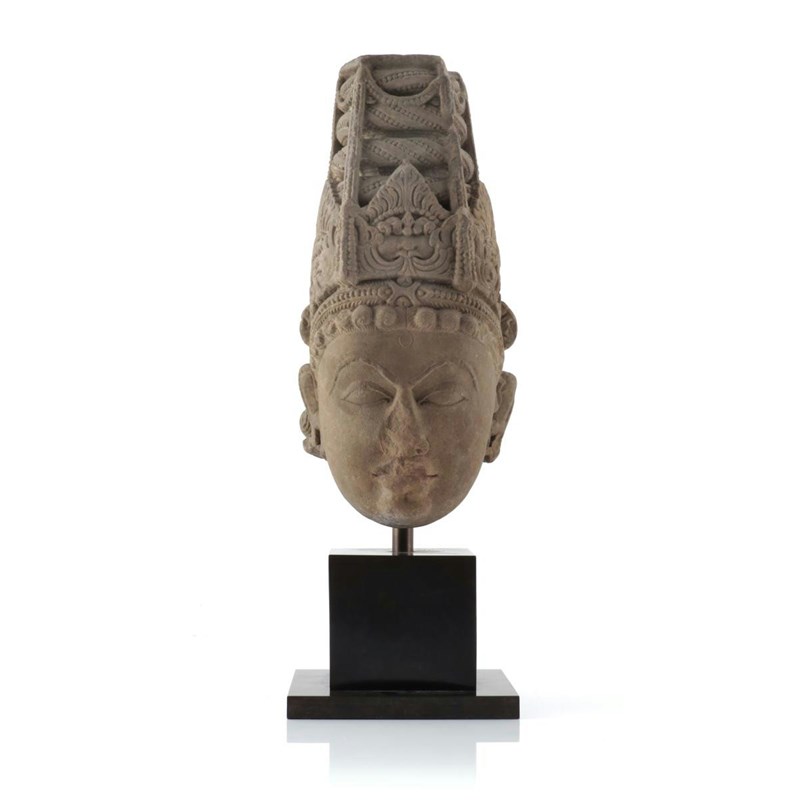 An Indian sandstone carving of the head of a deity c.10th-12th century, the features finely defined beneath a tapering elaborate tiered headdress, raised on a modern plinth, 28cm. (2)