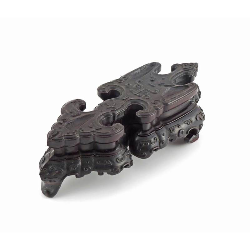 A Chinese black hardwood stand 18th century, of scrolling arrow-head shape, carved in relief with taotie masks, C-scrolls and ruyi, the base raised on three feet, 18.1cm.