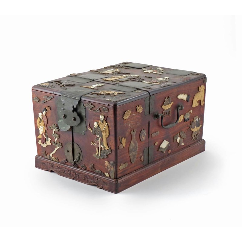A Chinese hardwood travelling vanity chest 19th century, the hinged cover opening to reveal a mirror above an arrangement of variously sized drawers, with two further hinged compartments extending to the sides, each carved with curling acanthus leaves, the cover applied to the exterior with mother of pearl, ivory, soapstone and hardstones depicting figures, birds and animals, carrying handles to the sides, 22cm x 38.5cm x 28cm.