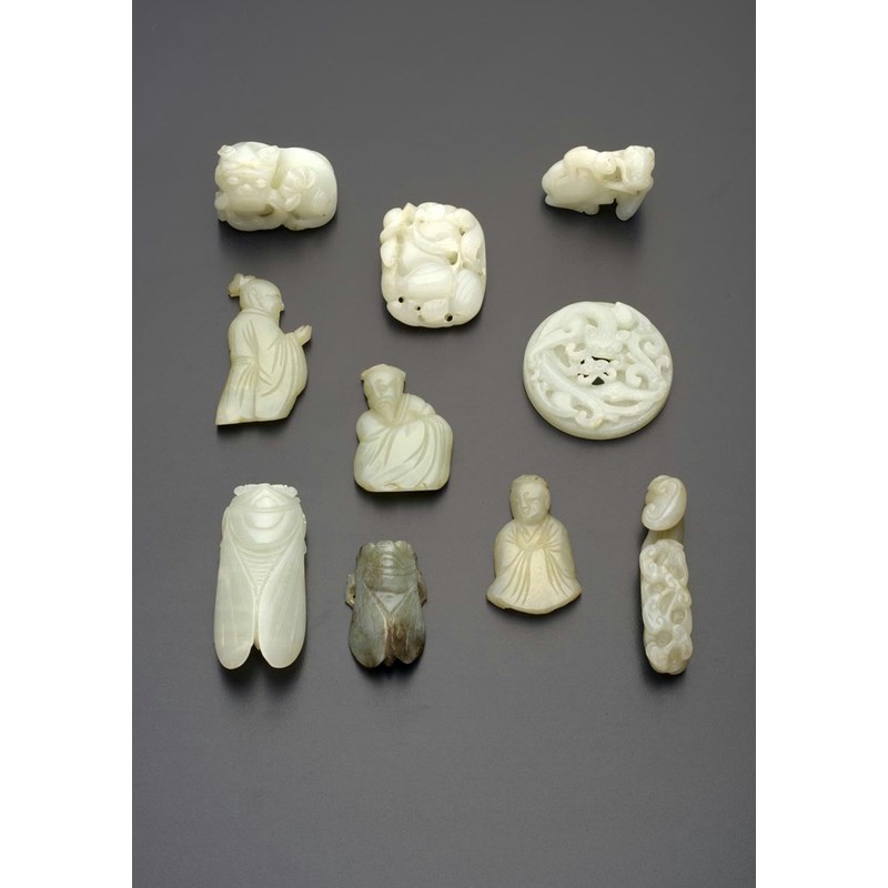 Ten small Chinese pale celadon jade carvings 18th/19th century, variously carved, comprising: two cicadas, three appliqués formed as figures, a bi disc, a Buddhist lion dog, a horse with a money, a lingzhi-shaped belthook and a reticulated plaque carved as fruit, 7.5cm. (10)