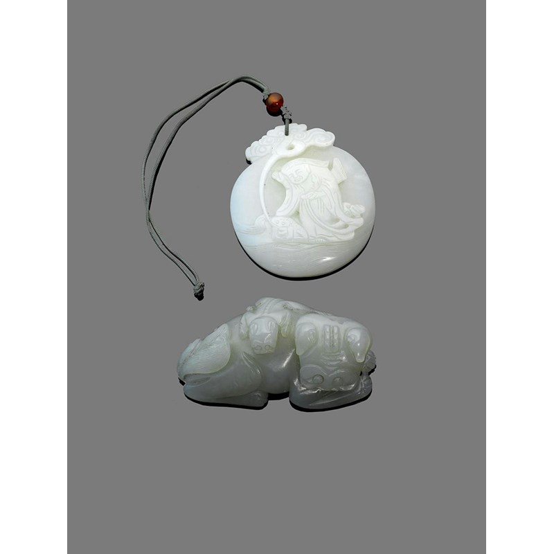 十八/十九世紀 青白玉雕少獅太獅擺件及劉海戲蟾佩 一組兩件