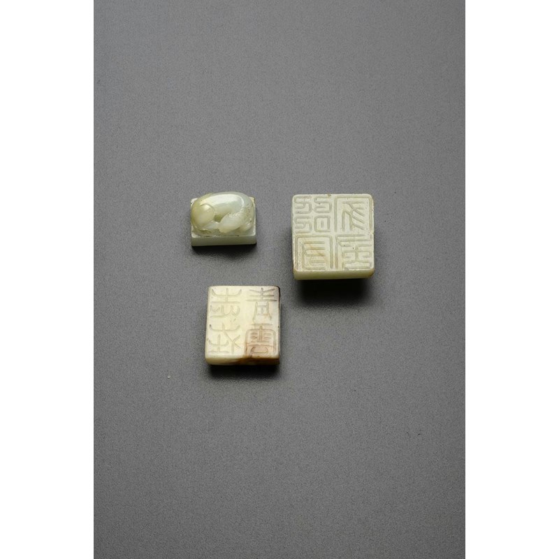 Three small Chinese celadon jade seals 17th-19th centuries, one rectangular and uncut, surmounted by a recumbent horse chewing its back leg, the other two with a four character mark to the base, each pierced to the top, 3.5cm max. (3)