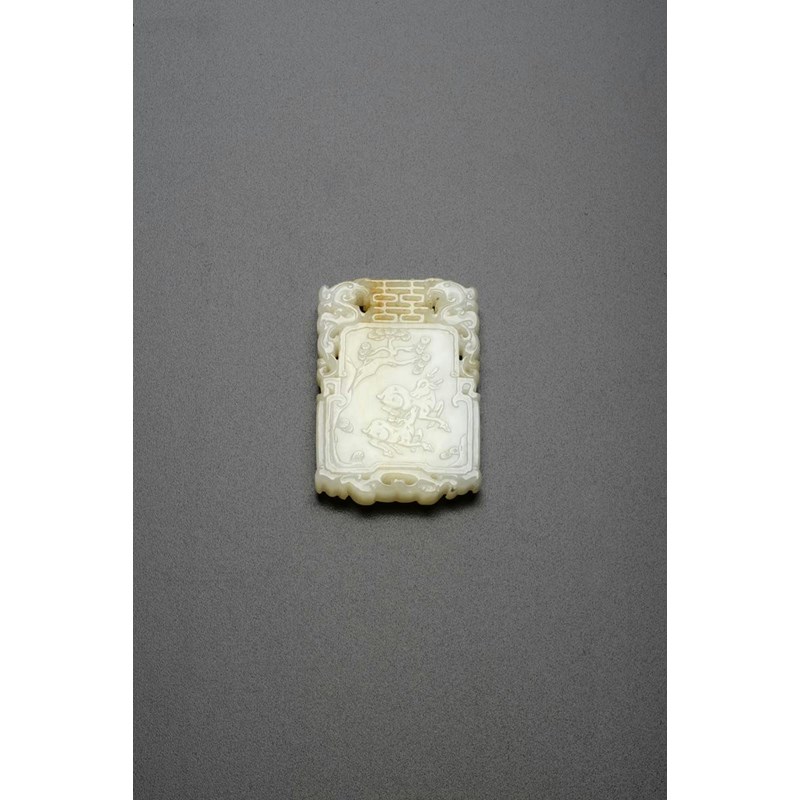 A Chinese white jade rectangular openwork plaque 19th century, carved in shallow relief to one side with two deer beneath a pine tree, to the other with an inscription and mark which reads bieyou tiandi fei renjian, surmounted by a double happiness symbol between two dragons, 6.4cm.