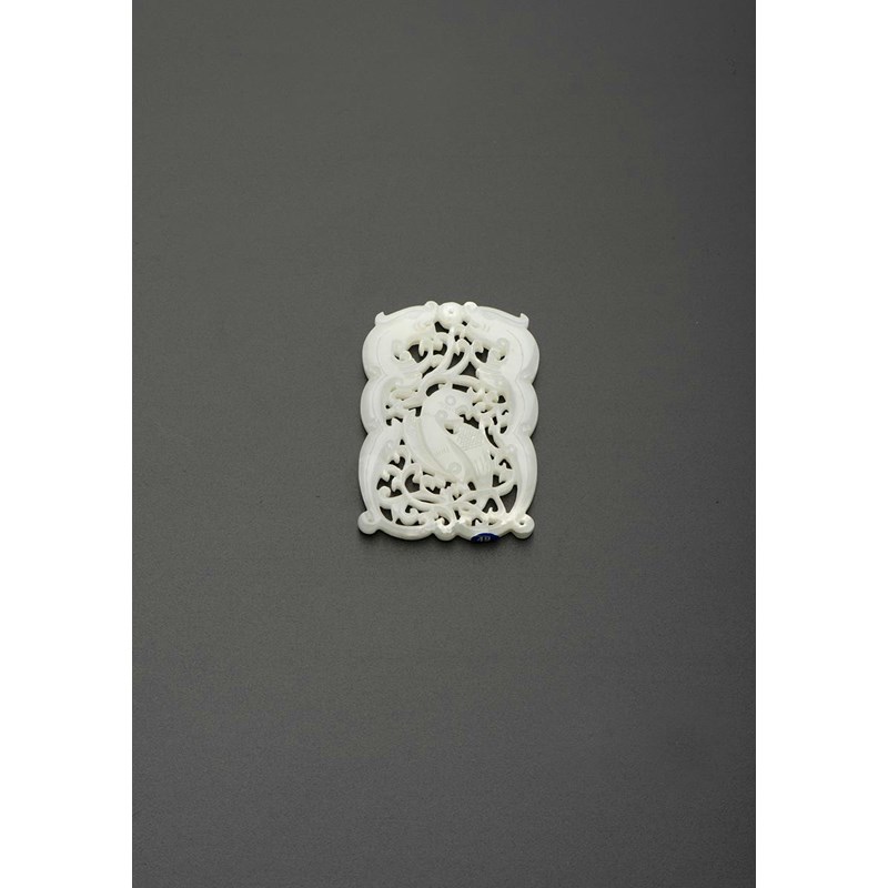 A Chinese pale celadon jade reticulated plaque 18th/19th century, carved with a central bird flanked by two mythical beasts and enclosed by open scroll work, 7cm.