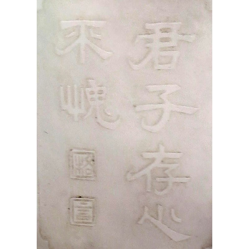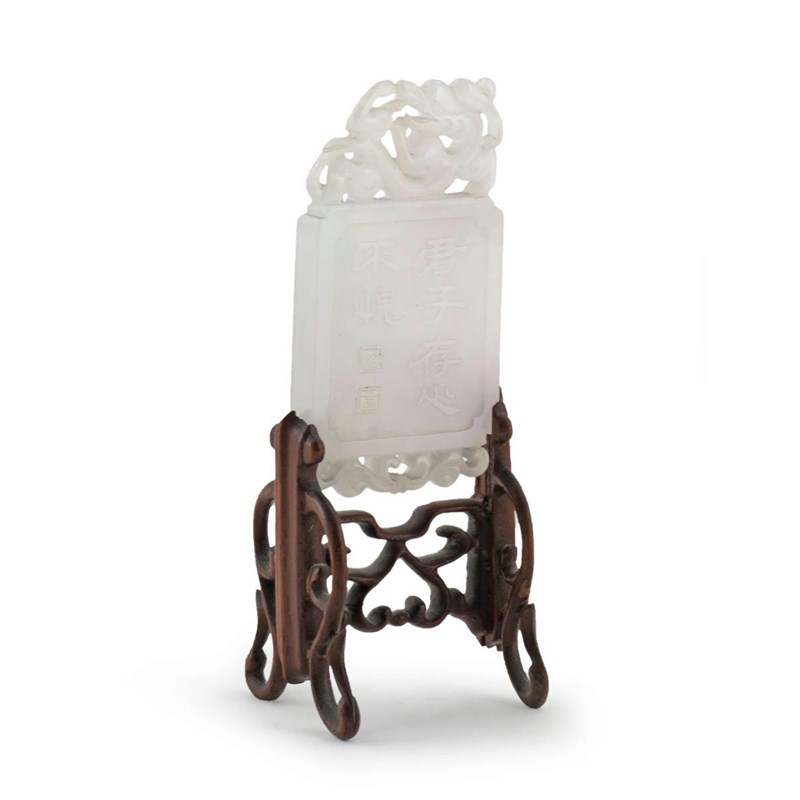 A Chinese white jadeite plaque late Qing dynasty, carved in shallow relief to one side with the characters lin shi yi fang yuan, to the reverse with jun zi cun xin bu kui, a dragon surmounting the plaque, raised on a scrolling hardwood stand, 7cm. (2)