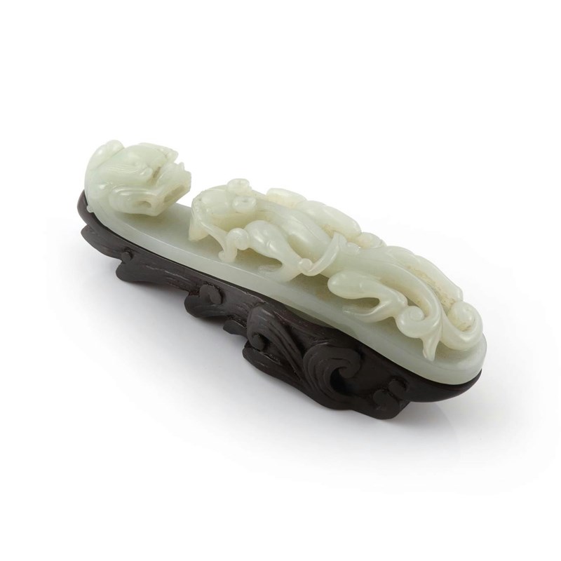 A large Chinese pale celadon jade belthook 18th century, carved with a dragon's head terminal, the shaft with a smaller sinuous dragon, carrying a lingzhi fungus in its mouth, raised on a fitted hardwood stand, 13.7cm. (2)