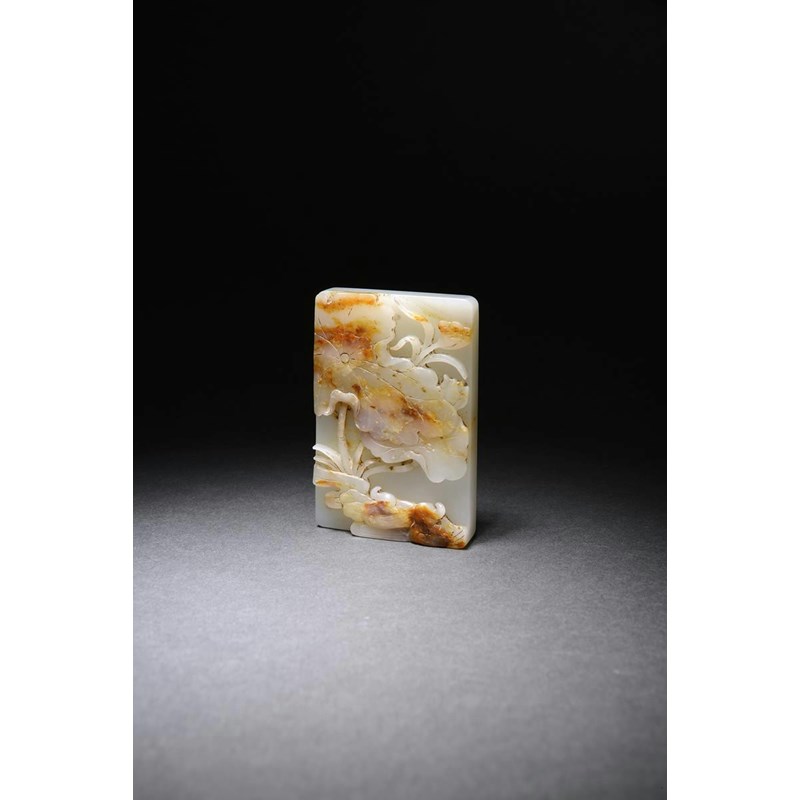 A Chinese white jade rectangular plaque 19th or 20th century, carved in relief to one side with two Mandarin ducks swimming beneath an enormous lotus plant, to the other with two quail beneath millet, a four character mark which reads sui sui ping an, the stone with russet striations, 6.2cm.