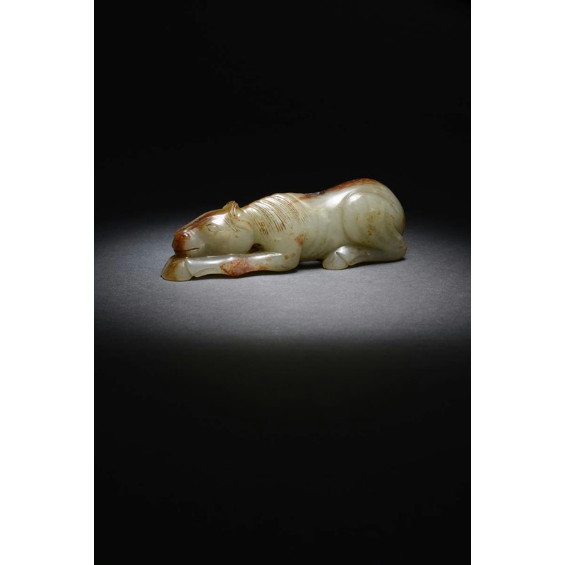 A Chinese celadon and russet jade carving of a recumbent horse 18th/19th century, with its head resting on its outstretched front legs, its hind hooves tucked beneath its haunches, the ribs protruding from the body, 10.2cm.