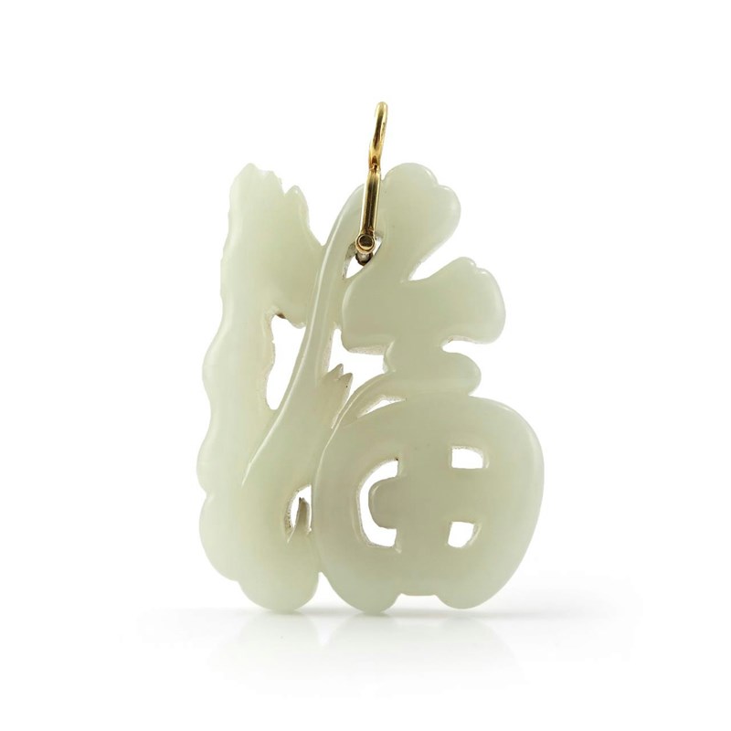 A Chinese pale celadon jade pendant 20th century, carved as a fu character, suspended from a gold mount, 5.5cm.
