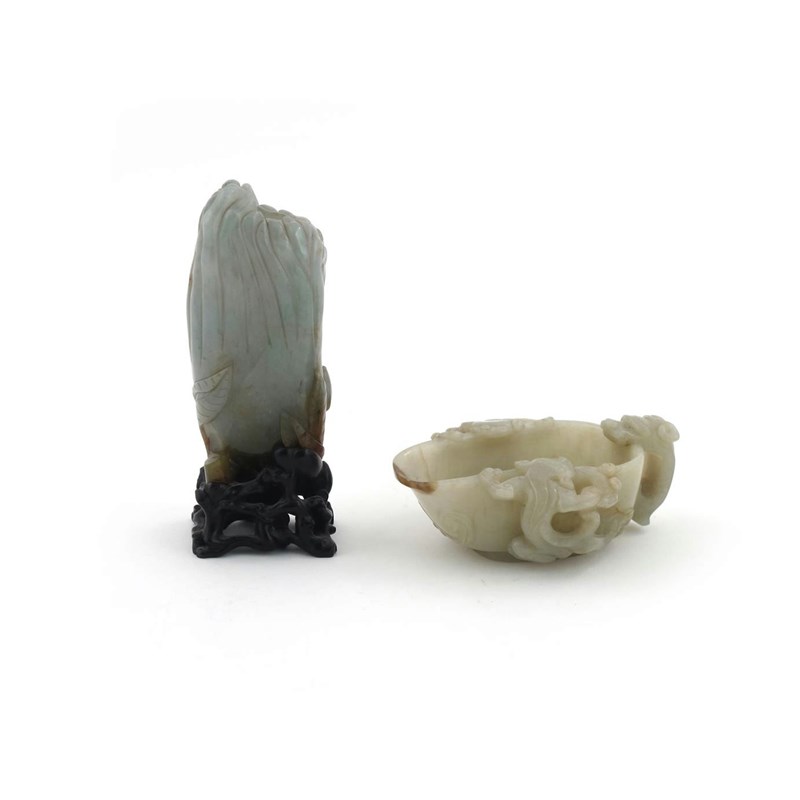 A Chinese celadon jade pouring vessel 19th century, carved with sinuous chilongs clambering upon the rim, the handle with a dragon's head terminal, together with a celadon jade carving of a finger citron, glued to a hardwood stand, 17cm overall. (2)